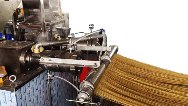 本生產(chǎn)線采用擠壓非膨化技術(shù),通過高壓高溫使雜糧淀粉糊化并形成條狀;本設(shè)備適用于多種雜糧谷物,針對不同糧食的特性,只需調(diào)整相關(guān)的PLC參數(shù),即可實現(xiàn)不同原料雜糧面條的生產(chǎn)。